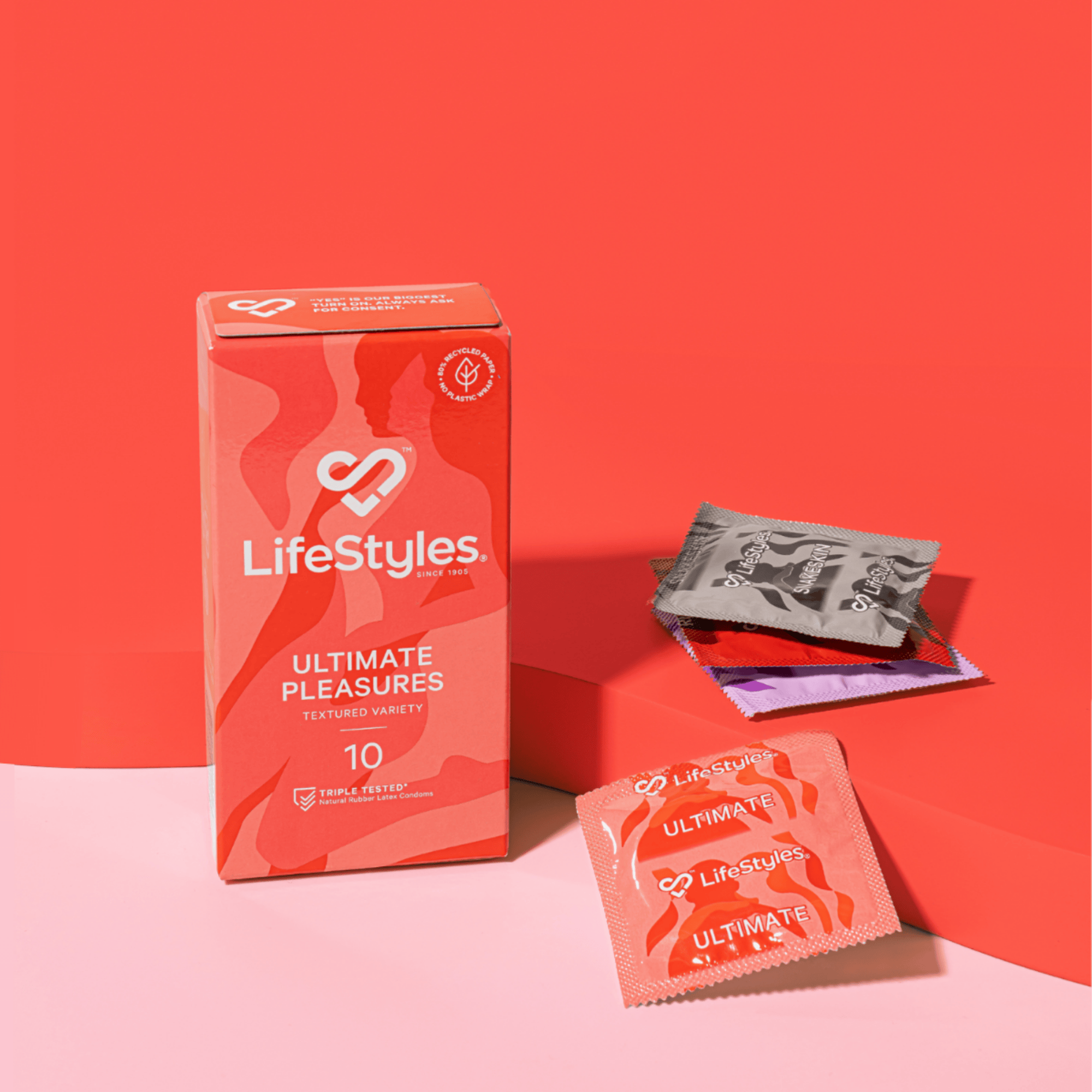 LifeStyles® condom boxes have no plastic wrap and are made from 80% recycled paper. Feel-good protection since 1905.